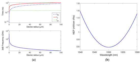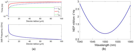 (a) Constant times characterizing the proposed PD and 3 dB roll-off frequency as a function of the bGr disk radius, and (b) spectral NEP.