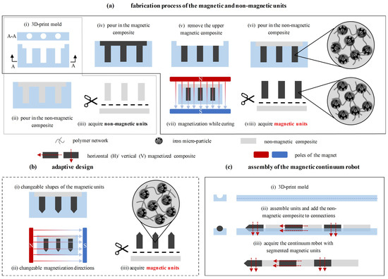 To achieve the rapid mass fabrication of such an MMCCR, a molding technology was applied as the main method, and silicone rubber with/without iron microparticles was utilized to construct the soft body. First, as shown in Figure 2a–i, molds with multiple long holes were printed with a micro 3D printing system (Form 3+, Formlabs Inc., Somerville, MA 02143–02145, USA) with printing precision of 50 μm. Then, Precursors A and B of the silicone rubber, i.e., Dragonskin #20 (Smooth-on Inc., Macungie, PA 18062, USA) were mixed evenly at a weight ratio of 1:1 and vacuumed to reduce air bubbles within. Third, the mixture was poured into the mold and cured under 70 °C for 30 min (Figure 2a(ii)). The nonmagnetic units of the MMCCR were obtained by cutting the soft pillars out (Figure 2a(iii)). The magnetic units could be similarly fabricated. By adding iron microparticles (Guangzhou Metallurgy Co., Ltd., Guangzhou, China) into the precursor mixture that had an A:B:iron weight ratio of 1:1:1.5, the magnetic composite was obtained. Then, the magnetic mixture was poured into the mold (Figure 2a(iv)), and the upper layer was removed after 5 min of vacuuming (Figure 2a(v)). Then, a layer of a nonmagnetic composite was used as a cover (Figure 2a(vi)), and the mixture was cured under 70 °C for 30 min while a uniform magnetic field was applied (Figure 2a(vii)). During curing, the embedded iron microparticles were rearranged to align them with the applied magnetic field (as shown in the magnified subfigure). Lastly, the magnetic units with horizontal magnetization direction could be cut out (Figure 2a(viii)). To achieve variable poses and adaptation to different environments, the discrete section could also be molded into varied contours and magnetized into diverse directions. Here, we demonstrate an adaptive designs for a magnetic unit with a conical tip (Figure 2b(i)) and vertical magnetization direction (Figure 2b(ii/iii)). Once all the magnetic/nonmagnetic units had been obtained, the magnetic continuum robot could be assembled. As shown in Figure 2c, multiple units with/without magnetic response could be connected after curing with the same nonmagnetic composite. Lastly, MMCCRs were obtained with a diameter of 3 mm for the main body and a conical tip of around 1 mm.