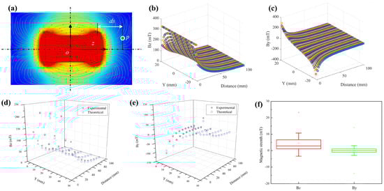 To control the proposed MSCR, a gradient magnetic field was first established and characterized. Four Nd–Fe–B magnets (N52, Shanghai Yanti Metal Materials Co., Ltd., Shanghai, China) with dimensions of 45 × 45 × 20 mm were serially connected as the magnetic field source. To characterize the generated magnetic field, the planar distribution (y–o–z) of a magnet (45 × 45 × 80 mm) was first simulated in COMSOL Multiphysics software (v. 5.4), as shown in Figure 3a. According to the thermal map and virtual magnetic induction lines (i.e., the curved arrows), the magnetic strength was symmetrical with respect to the x–o–z plane and decreased with the increase in distance; the arrow density showed symmetrical distribution and became more dispersed. Setting a point P with a distance of ds from the right surface of the magnet, the theoretical magnetic field strength of that point could be computed on the basis of a permanent magnet model [41]. The calculated distribution in the y–o–z plane along the Bz and By axes against the y coordinate and distance ds are found in Figure 3b,c, respectively. Magnetic strength along the Bz axis was symmetrical with respect to the x–o–z plane, while By strength was symmetrical on the basis of the z axis. The magnitude of the two gradually decreased as the distance increased. The trend of the calculated magnetic field distribution was the same as that in the simulated results (Figure 3a).