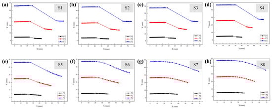 Figure 5 shows that all 8 MMCCR schemes experienced a decrease in the y coordinate as the x coordinate increased, which suggests that the entire MMCCR body was bending. Schemes S1 to S5 showed an obvious discontinuity in their recorded trajectories (Figure 5a–e), which means that a sudden positional change had occurred during the process of approaching the magnetic source. However, the positional change shrank; for example, the coordinate variation in P1 was (38.28, −19.86) mm for S1, and (26.26, −10.94) mm for S5. Schemes S1 to S4 showed similar trajectories, with an almost constant y coordinate before and after the sudden change moment, while there was a distinct y coordinate decrease in Scheme S5 after the moment. However, for Schemes S6 to S8 (Figure 5f,g), the recorded trajectories of the three magnetic units became smoother, i.e., without positional mutation. The trajectories showed a gradual decrease trend for the entire moving process. P1 variation in the y coordinate shrank: −14.83, −12.64, and −12.54 mm for S6, S7, and S8, respectively.