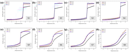 Regarding the pose information recorded in the dynamic process, the suddenly increased bending angles of Schemes S1 to S5 (Figure 6a–e) were consistent with the corresponding positional change shown in Figure 5. Bending angles α1 and α2 of Schemes S1 to S3 always had the same change trend, with the former angle being slightly larger than the latter after the mutation moment. This law started to change in Scheme S4, where bending angle α2 had a greater increasing trend after the mutation moment and was larger than α1 (Figure 6d). Then, the new law was more obvious in Schemes S5 to S8 shown in Figure 6f–h. However, the recorded bending angles of the three magnetic units became continuous in Schemes S6 to S8. When considering Schemes S1 to S8, variation in the three bending angles shrank, while the increasing trend of angle α3 became more apparent.