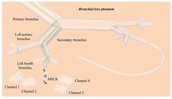 To demonstrate the adaptive navigation of MMCCRs, a multichannel access experiment was conducted. As shown in Figure 7, an MMCCR with a long soft rear body (yellow tube) passed through the bronchial tree phantom and extended its magnetic head out of the fourth bronchus to access different channels (see dimensional details in Figure S5).