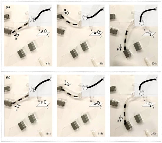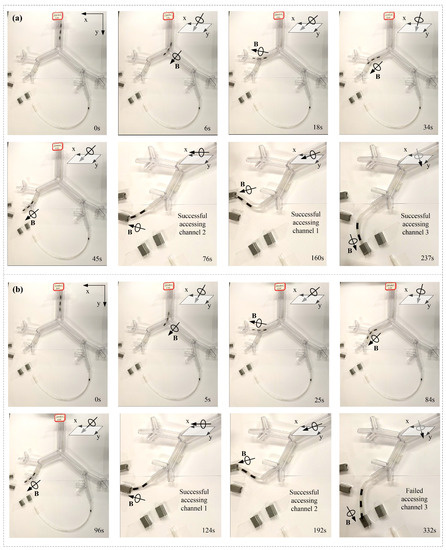 To better understand the channel-access capacity of the two MMCCRs, the robot’s status before the upcoming access is shown in Figure 10. With a magnetic field applied parallel to the x–o–y plane, the S8 robot showed a slight S shape when accessing Channels 1 and 2. The slight S shape had also appeared before Channel 3 was accessed under the magnetic field from the x–o–y plane. However, when accessing all three channels, the S1 robot presented a single curvature pose under a similar applied magnetic field (Figure 10b). The above deformation of the S1/S8 robot coincided with the calibrated status shown in Figure 4a. The S1 robot was suitable for reaching a larger workspace even though it had a single curvature that could be applied to understand the relatively short period of accessing Channels 2 and 1. The downward S shape of the S8 robot helped it in better adapting to the 10 mm distance between the central bronchial-tree and four-channel planes.