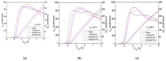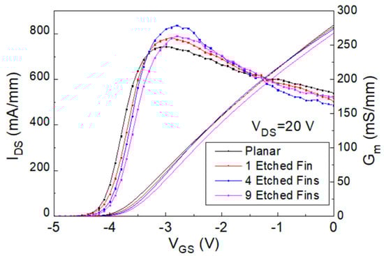 - Jo, Y.-W.; Son, D.-H.; Won, C.-H.; Im, K.-S.; Seo, J.H.; Kang, I.M.; Lee, J.-H. AlGaN/GaN FinFET With Extremely Broad Transconductance by Side-Wall Wet Etch. IEEE Electron Device Lett. 2015, 36, 1008–1010. [Google Scholar] [CrossRef]