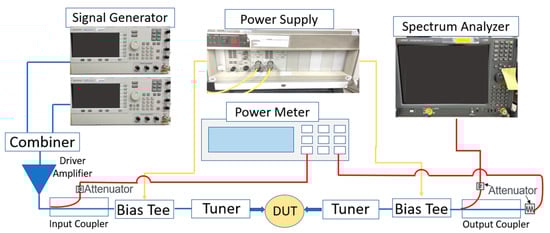 - Bailey, M.J. Intermodulation distortion in pseudomorphic HEMTs and an extension of the classical theory. IEEE Trans. Microw. Theory Tech. 2000, 48, 104–110. [Google Scholar] [CrossRef]