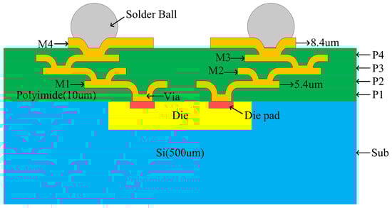 The cross-sectional view of the silicon-based IPD process used in this paper is shown in Figure 1. As can be seen, other process dies can be embedded into the silicon substrate using WLP technology and connected to the external environment through die pads, vias, and solder balls using embedded fan-out packaging. The IPD process consists of four metal layers (M1, M2, M3, and M4) made of copper (Cu) and four low dielectric constant material layers (P1, P2, P3, and P4) made of polyimide. Each dielectric layer has a thickness of 10 µm. Copper metal layers M1, M2, and M3 are embedded in P2, P3, and P4, respectively, with a thickness of 5.4 µm. The M4 metal layer is placed on top of the P4 dielectric layer, with a thickness of 8.4 µm, which results in less conduction loss in this layer. The dielectric constant () and resistance per unit length of the silicon substrate are 11.9 and >3 k·cm, respectively, and it can be thickened to 500 µm. The dielectric polyimide has a dielectric constant of 3.2 and the loss tangent of 0.009. This higher substrate resistivity, thicker substrate, and the smaller dielectric loss tangent allow for lower losses in the IPD technology. In addition, the minimum line and gap widths for all metal layers are both 15 µm. It is worth noting that the silicon-based IPD process used in this paper has better reliability, stability, and lower cost compared to the glass-based IPD process, as silicon material has better performance at high frequencies and temperatures and is cheaper. In addition, due to the thinner dielectric layer of the silicon-based IPD process, higher integration and smaller size can be achieved.