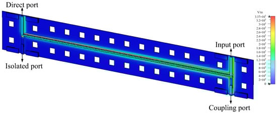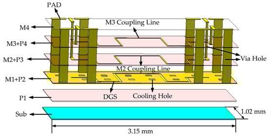 The three-dimensional (3D) view of the proposed type A coupler is shown in Figure 2. To reduce radiation loss, the type A IPD coupler uses M2 and M3 metal layers for broadside-coupling. However, due to processing limitations, the line width of the coupling line cannot be too thin, resulting in weak coupling and low directivity when using only broadside-coupling. In order to solve these difficulties, the DGS structure is etched on the M1 grounding metal layer to enhance coupling. Via holes are utilized to connect the signals to the top layer, and the cooling holes are required for machining. Additionally, four ground–signal–ground (GSG) pads are matched to 50 . To further minimize the size of the coupler, both the coupling lines and the DGS are arranged in a serpentine configuration, resulting in a final circuit size of 3.15 mm × 1.02 mm. During the initial design stage, the coupling lines were straight. A coupling line width of 20 µm was selected, and the coupling line length was determined to be 4193 µm by