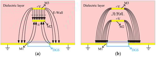 Electric field distribution diagram of coupled lines based on Defective Ground Structure (DGS): (a) ddd mode. (b) even mode.