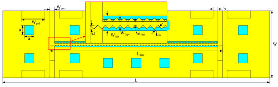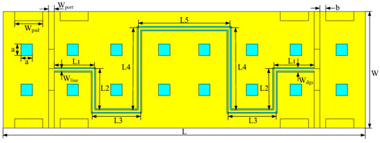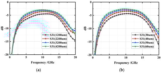 To verify the characteristics of the DGS structure for coupling in the proposed coupler, simulations were conducted using Computer Simulation Technology (CST) software, with different geometric parameters for the DGS structure. The results are shown in Figure 4. It can be observed that the coupling is primarily determined by the length and width of the DGS structure. Keeping the width of the DGS structure constant and varying its length, the coupler was simulated at different lengths of the DGS, which were 4200, 3200, 2200, and 1200 µm, respectively. As shown in Figure 4a, the coupling of the coupler becomes tighter as the value of the length increases. Conversely, when the length is kept constant and the width is varied at 60, 50, 40, and 30 µm, respectively, the coupling becomes tighter as the value of the width increases, as shown in Figure 4b. These results can be attributed to the fact that a larger DGS area results in a greater difference between the odd- and even-mode phase velocities, leading to enhanced coupling. Therefore, the coupling can be flexibly adjusted by changing the size of the DGS structure. After simulation optimization, the length of the DGS structure was selected to be 4200 µm, and the width was chosen as 40 µm to achieve the desired coupling degree of 3 dB. The top view and dimensions of the type A design is shown in Figure 5, and the geometric parameters settings are shown in Table 1.