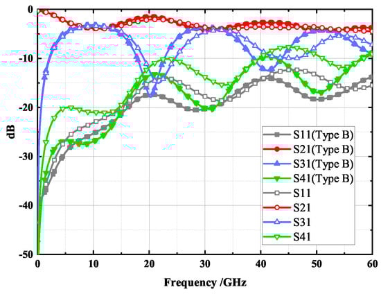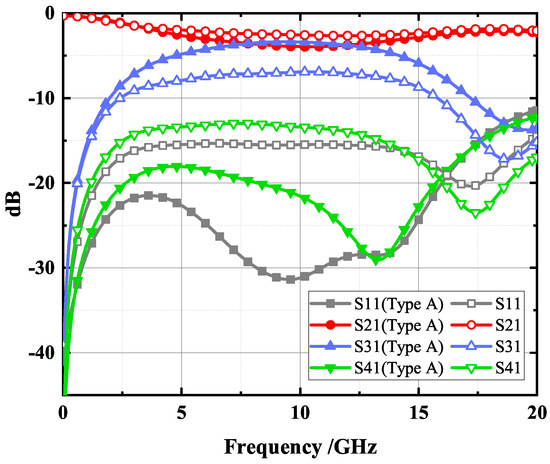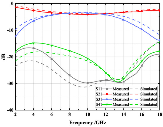 The measured S-parameters results of the proposed type A coupler are shown in Figure 16 and are consistent with the simulated results. The measurement results demonstrate that the proposed type A coupler at the center frequency of 10 GHz exhibits a 3 dB coupling response at 6.5–12.2 GHz, and a maximum coupling of 3.5 dB is obtained at 9.5 GHz. The proposed type B coupler has an isolation of less than 16 dB and return loss of less than 22 dB over a relative bandwidth of 60.96%. This good performance is attributed to the use of the DGS structure, which effectively enhances the coupling and improves the directivity of the coupler.