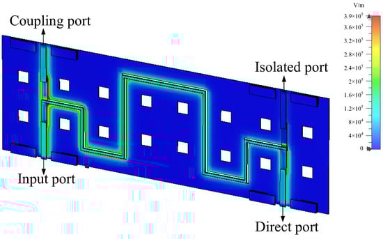 The design was modeled and simulated in CST software, using a time-domain simulation solver with the simulation frequency set to 0–20 GHz. To better visualize the energy propagation, electric and magnetic field monitors at different frequencies were added in the simulation. Figure 6 provides a comparison of S-parameter simulation results for the structure with DGS and without DGS. The simulation results without the DGS, represented by the dotted lines, show a coupling degree of only about −7 dB, indicating poor isolation and return loss. The simulation results for the proposed type A coupler with a DGS structure, represented by the solid lines, show a coupling degree of −3.36 dB at the center frequency of 10 GHz and isolation and return loss of <−18.9 dB and <−28.5 dB, respectively, within the frequency range of 6.7–12.5 GHz. This effectively enhances the coupling degree and directivity of the coupler. Figure 7 shows the electromagnetic (EM) simulation result of the proposed type A coupler at 10 GHz, where the power input to coupler can be divided into direct and coupling ports, while isolation port has no power output. Based on the above EM simulation results, the proposed type A coupler was fabricated on the IPD process, and the chip layout photo is shown in Figure 8.