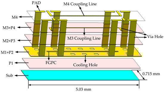 The three-dimensional (3D) view of the proposed type B coupler is shown in Figure 9. This design uses M4 and M3 metal layers for broadside-coupling to minimize conductor loss and improve the quality factor of the passive device. Different from type A, type B adopts a floating ground-plane conductor (FGPC) structure to enhance the coupling and further improve the directivity of the coupler. Additionally, the coupling lines are fine-tuned with a swing structure to match the odd- and even-modes speeds for better directivity. This design provides good isolation and return loss not only at 10 GHz, but also in the next two frequency bands. Similar to type A, the via holes are used to connect the signals to the top layer, the cooling holes are required for machining, and four ground–signal–ground (GSG) pads are matched to 50 .The size of the proposed type B coupler is 5.03 mm × 0.715 mm.