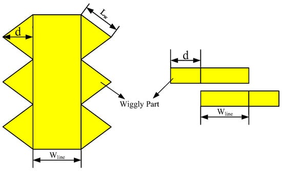 The wiggly lines with edge-coupling can effectively improve the directivity, and has been confirmed in [28,29]. When the coupled line is in a nonuniform medium, the directivity of the coupler can be poor due to the uneven phase velocities of its odd- and even-modes. To address this issue, the type B coupler proposes wiggly lines with broadside-coupling that decelerate the odd-mode phase velocity without affecting the even-mode phase velocity. This leads to an improvement in the directivity of the directional coupler. The proposed wiggly lines are depicted in Figure 10, where the top and side views are shown on the left and right, respectively. In this design, represents the side length of the triangle, d denotes the height of the triangle, and w represents the line width. Similar to edge-coupled wiggly lines [30], if is used to represent the unit equivalent odd-mode capacitance of the straight-coupled line, the unit equivalent capacitance of the wiggly-coupled line can be represented by as
