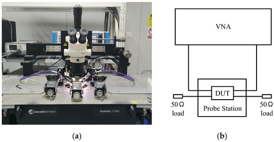 The performance of the two types of couplers was measured using a Vector Network Analyzer (VNA), as shown in Figure 15a. The measurement system topology graph of the coupler is shown in Figure 15b. A VNA (Ceyear 3672E) with a frequency range of 10 MHz to 67 GHz was used to measure the S-parameter of the coupler. The device under test (DUT) was placed on the probe station (Cascode Summit 11000). A short-open-load-thru (SOLT) calibration was performed on the on-wafer. In order to measure the full characteristics of the fabricated couplers using a two-port VNA, three measurements were carried out with different two-port terminations (50 load).