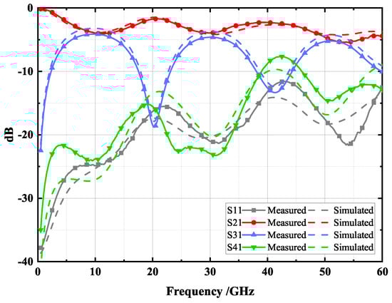 Figure 17 illustrates the measured and simulated results of the proposed type B coupler, where the solid lines represent the measured results and the dotted lines represent the simulated results. As can be seen from the figure, the measured curves are in general agreement with the simulation curves. The strongest coupling in the first, second, and third bands are 4.13 dB, 4.61 dB, and 5.21 dB, respectively. The proposed type B coupler has <−21 dB isolation and <−23 dB return loss in the first band at 7–13 GHz; in the second band at 28–32.5 GHz, it has <−22 dB isolation and <−19 dB return loss; in the third band at 49.5–54.5 GHz, it has <−12 dB isolation and <−17 dB return loss. This performance enables the coupler to operate in three frequency bands, laying the foundation for a high efficiency harmonic controlled Radio Frequency Power Amplifier (RFPA) design.