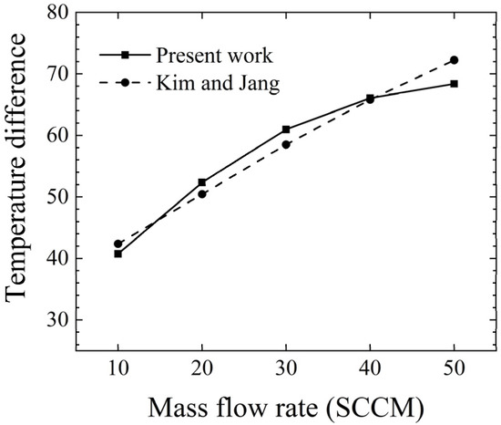 Similarly, in order to investigate the variation of the temperature difference between the upstream and downstream heat sources of the thermal flowmeter with mass flow rate during operation,