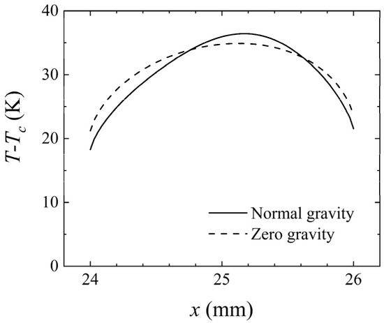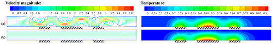 The flow field and temperature distribution of the liquid inside the channel were calculated under the presence and absence of gravity, as shown in