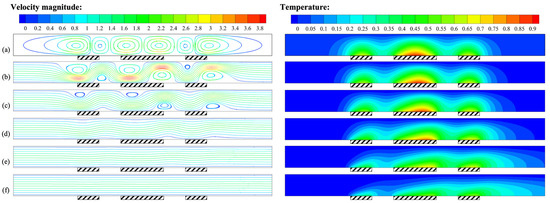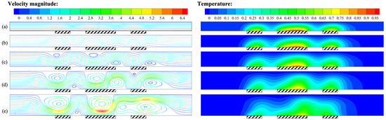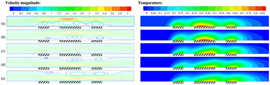 Specifically, when H = 1.4 mm, the position of the highest temperature in the heat sources moved to the right. The distance between the heat sources was relatively small compared to the height of the flow channel, resulting in a mutual influence of the buoyancy convective cells generated by adjacent heat sources. This also caused abnormally high temperatures downstream of the intermediate heat source.