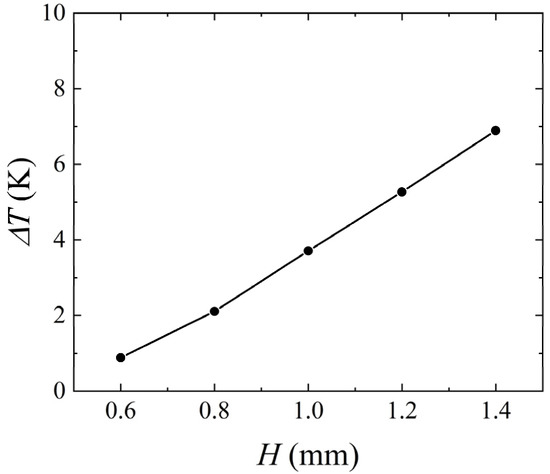 H increased from 0.6 mm to 1.4 mm, buoyancy convection gradually became dominant, causing the temperature difference between the upstream and downstream heat sources to increase from 0.89 K to 6.89 K. Overall, the analysis above indicated that the channel height significantly affected the temperature difference between upstream and downstream heat sources.