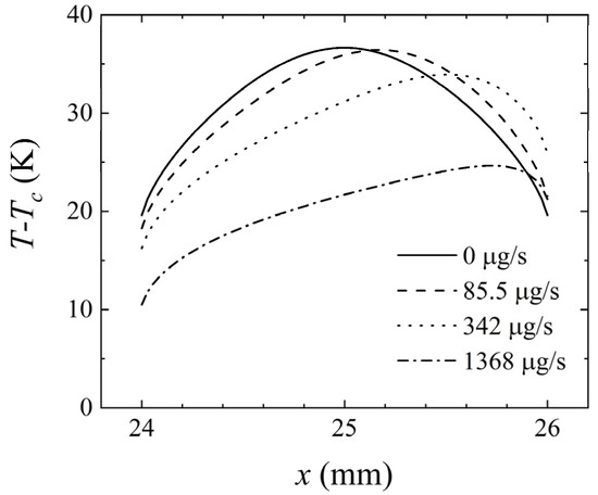 Q = 0 μg/s, the temperature distribution was symmetric, and the fluid was only affected by buoyancy convection. As
