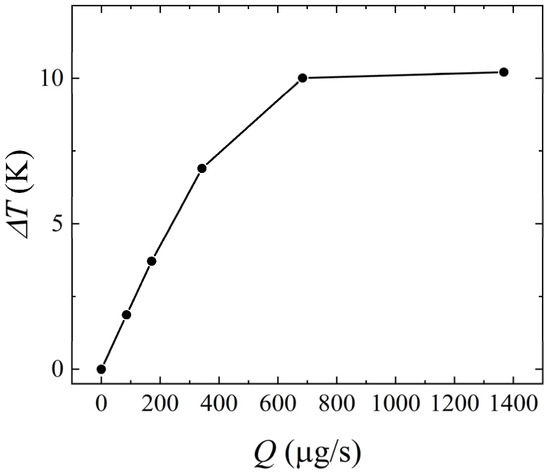 Q was greater than 342 μg/s, the rate of increase in temperature difference between the upstream and downstream heat sources slowed down, and the influence of forced convection increased. It is worth mentioning that, in order to ensure measurement sensitivity, the mass flow rate range allowed for the operation of the thermal flowmeter to be the stage with a lower mass flow rate.
