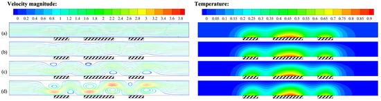 Q = 0, the streamlines and temperature distribution in the channel were symmetric, and only buoyancy convection existed. When