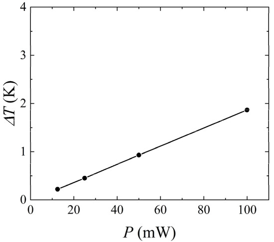 P increased from 12.5 mW to 100 mW, the temperature difference between upstream and downstream heat sources increased from 0.22 K to 1.87 K, revealing a linear relationship between heating power and the temperature difference. Therefore, under the premise of ensuring that the measured liquid did not undergo phase change and did not cause a flow pattern transition within the range of mass flow rate measurement, appropriately increasing the heating power could increase the sensitivity of the thermal flowmeter.