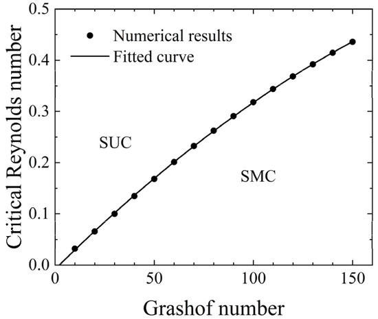 To avoid phase changes, the relationship between the Reynolds number and the Grashof number was fitted using a quadratic polynomial. In this case, the constant term was closer to zero than that of a linear curve, better representing the critical condition where the Grashof number is equal to zero under zero inlet velocity.