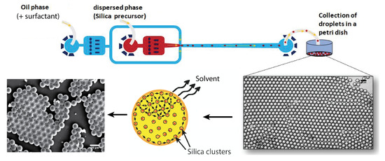 The ESE method suffers, however, from a rather broad size distribution of the synthesised microspheres, owing to the poor control of the distribution size of the templating droplets, which is simply obtained by vigorous mechanical stirring of the emulsion. We have developed, in a previous work [13], a two-step droplet microfluidic approach, which enables the fabrication of well-defined monodisperse mesoporous silica hollow microspheres (microcapsules), whose size, shape and composition can be readily controlled in a very accurate manner. Droplet-based microfluidics have proven to be a straightforward and robust approach to address the size distribution of ESE-based mesoporous microspheres at the microscale [14,15,16] and highly functional monodisperse microcapsules (see for recent reviews References [17,18,19]).