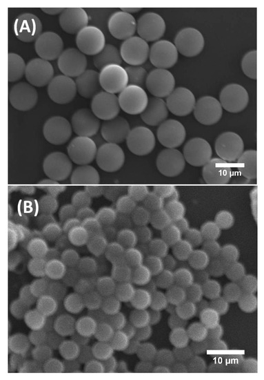 Figure 2 shows scanning electron microscopy (SEM) images of synthesised solid silica microspheres derived from droplets prepared with and without P123 molecules. They are labelled here P123+ and P123− microdroplets, respectively. It is worth noting that, although both types of P123+ and P123− initial droplets had a similar diameter, 31.5 μm (±1 μm), the resulting microparticles exhibited two noticeably different sizes. For microparticles derived from P123+ microdroplets, we obtained highly monodisperse microspheres with a diameter of about 10 μm (±0.5 μm). These microparticles are referred in this study as the MP (or mesoporous) microparticles or microspheres. For microparticles derived from P123− droplets, we obtained microspheres with a diameter of about 5.2 μm (±0.8 μm), as shown in Figure 2B. We refer to them as the NMP (or non-mesoporous) microparticles or microspheres.