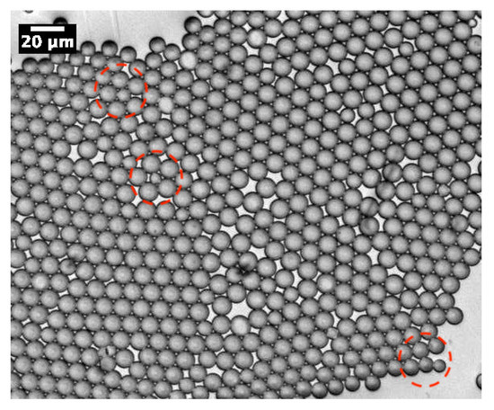Droplets were collected in a Petri dish and dried at a temperature of 150 °C (under normal pressure). Because of the higher mass density of the fluorocarbon oil () in relation to the sol phase (), collected droplets formed a well-organised floating layer on the surface of the fluorocarbon oil, as illustrated in Figure 1. Moreover, because perfluorocarbon oils are chemically inert, they do not solubilise any of the droplet content unless a high concentration of surfactant is used, which is not the case in the present study; diffusion and dispersion of both solvents and sol may be neglected during the flow of droplets along the microfluidic channel and the tubing. In order to emphasise such a feature, we measured and checked that droplet size remained practically constant during the flow along the microfluidic channel and tubing, from the nozzle production area to the collecting Petri dish, i.e., 31.5 μm.