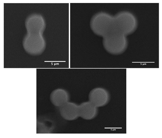 As demonstrated in our previous work [13], MP microparticles actually consist of microcapsules with a mesoporous silica shell, whose thickness and mass density () were found to be about 1 μm and 0.83 g/cm3, respectively. Comparatively, if we assume a similar microcapsular structure for NMP microparticles, we would find an average mass density of about g/cm3, which cannot be accepted, due to the total amount of silica encapsulated initially in each droplet (≃0.33 pg) and the known standard value of the mass density of silica, i.e., 2.2 g/cm3. Therefore, in order to match a reasonable value for the mass density of NMP microspheres, one should assume that each single P123− droplet will split into at least two or three daughter droplets, each of which would lead to an NMP microparticle with half or a third of the total amount of silica encapsulated in the initial (mother) microdroplets. In such a way, the average maximum mass density of the resulting P123− microparticles should be about 2.2 g/cm3 for a division by a factor of 2, or 1.5 g/cm3 for a division by a factor of 3. Furthermore, a division of the droplet volume by a factor of 4 may be envisaged, for which one may obtain a mass density for NMP microparticles of about 1.1 g/cm3. However, such divisions are not favourable from a surface tension point of view, as the total interfacial energy of three daughter droplets, for instance, is basically larger than the interfacial energy of their mother droplet, by a factor of . Nevertheless, our optical microscopy observations, performed during the condensation of P123− droplets, shows that such divisions indeed occur. We observe in Figure 3 the extrusion of small droplets from initial ones during the condensation process. We also observe the formation of bridges between these different droplets, which allows the droplet contents to homogenise and to average their size during condensation. Interestingly, Figure 4 also shows three SEM images where we can see two, three and four connected NMP microcapsules, as suggested above. These microparticles were obtained from single isolated mother droplets. We suggest that the droplet-stabilising surfactant molecules used may not distribute homogeneously around the droplet, caused for instance by the tip-streaming effect [22,23]. This effect may lead to instabilities of the droplet interface, through which the droplet content may be expelled and form smaller daughter droplets.