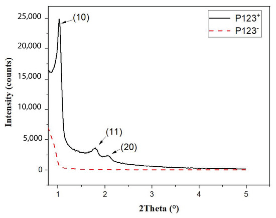 Small-angle X-ray diffraction pattern showing the ordering of hexagonal array of nanopores in mesoporous silica (P123+) microspheres and its absence in the non-mesoporous ones (P123−).