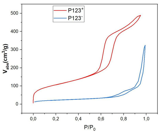 N2 adsorption/desorption isotherms of P123+ (red curve) and P123− (blue curve) samples.
