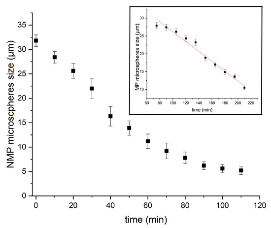 where represents the slope of the linear decrease in the size of the droplets due to the solvent evaporation process, and represents their average initial size.