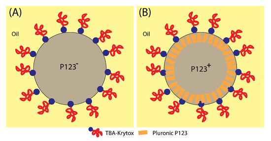 Schematic illustration of the organisation of silica meso-structuring surfactant (Pluronic P123) and droplet-stabilising surfactant (TBA-krytox) interfacial organisation. Addition of Pluronic P123 (A) increases the droplet interface rigidity and enhances its stability against droplet internal pressure and a subsequent division and the blobbing of a mother droplet, which leads in average to 3 daughter droplets when Pluronic P123 surfactant is missing (B).