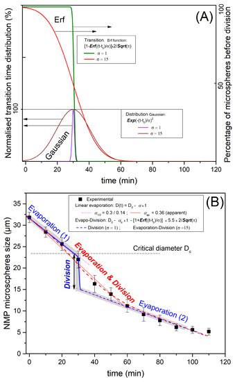 Since the division is occurring on the distribution scale, the change of droplet diameter could be represented by an error function (erf), which corresponds to the integral of the Gaussian distribution, drawn in purple and brown lines in Figure 10A, where we present two situations. An idealised one with a sudden division at and a more realistic one with a time duration representing the non-homogeneity of the local evaporation rate and critical radius (or a critical diameter ).