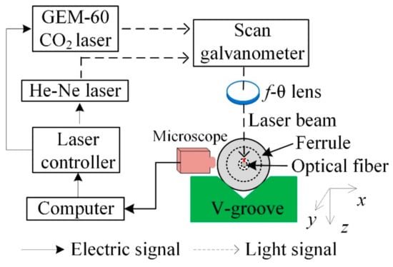 The experimental setup used for deep penetration laser welding (single-point welding or double-point welding) is shown in Figure 1. The laser is a waveguide cavity-sealed CO2 laser (Coherent Inc., GEM-60, Santa Clara, CA, USA) with a wavelength of 1064 nm and a continuous rated output power of 60 W. The unique resonator structure leads to good laser spot quality, with M2 = 1.1 and power stability of less than ±3%. For this laser, a control system based on the Labview platform was designed with a single-chip microcomputer as the core, which is used to accurately control the output time, duty cycle, and other parameters of the laser with a frequency of 24 kHz. The microscope in the figure is used to enlarge the image of the welding area to observe the laser welding effect during the welding process. The CO2 laser focuses its spot on the molten quartz glass ferrule through the focusing lens. The duration and average power of the laser are controlled by a software system based on the Labview platform. Reflector 1 is in the dotted line position when the CO2 laser works; a He-Ne laser, as the light source indicating the optical path, is used to adjust the optical path and determine the focal spot position. In the process of deep penetration laser welding, the laser focus is located on the surface of quartz glass ferrule just above the optical fiber. Therefore, after welding, the optical fiber is subject to out-of-focus annealing. Reflector 1 is in the solid line position when the He-Ne laser works; in the process of deep penetration laser welding, the laser beam, quartz glass ferrule, and quartz optical fiber are all stationary. Thus, it is considered that the effective thermal action of the laser can penetrate the wall of the glass ferrule by approximately 0.83 mm; however, the optical fiber does not fuse, owing to the thermal action of the laser. The quartz glass ferrule is fixed on a V-shaped groove, and the supporting platform of the V-shaped groove can be adjusted in the X, Y, and Z directions.