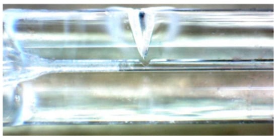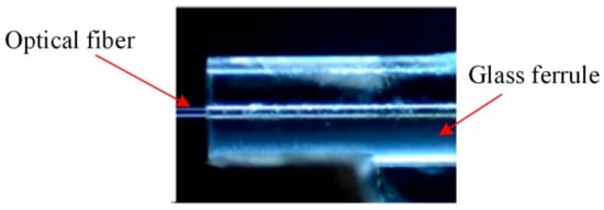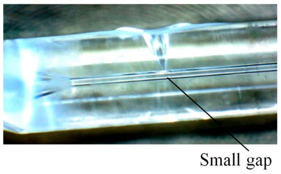 The quartz glass ferrule used in the experiment has a length of 7 mm and diameter of 1.8 mm. There is a through hole with a diameter of 126–128 µm in the axial position of the ferrule, and one end of the through hole has a tapered opening for forming the cavity of the optical fiber sensor. Before laser welding, the optical fiber was inserted into the through hole. The diameter of the optical fiber is 125 µm. Before inserting the optical fiber into the through hole of the quartz glass ferrule, the ferrule was cleaned three times by ultrasonic cleaning and dried, and the optical fiber was wiped with alcohol after removing the coating layer. The effect of inserting the optical fiber into the through hole is shown in Figure 2. There was a very small gap between the optical fiber and quartz glass ferrule. The schematic diagram of the welding effect with different parameters is shown in Figure 3. A keyhole was formed on the wall of the quartz glass ferrule.