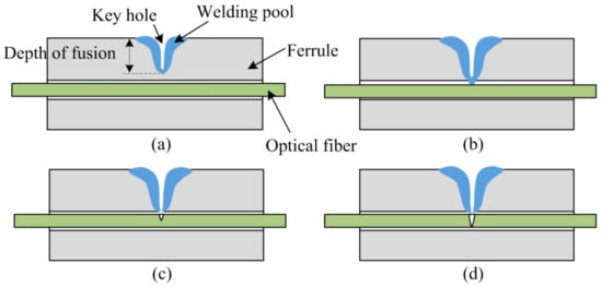 Schematic of the effect of deep penetration welding between the optical fiber and quartz glass ferrule. (a) Incomplete penetration: insufficient laser energy and keyhole penetration depth that is too small; (b) optimal penetration (penetrating the base material only): proper laser energy and appropriate penetration depth of keyhole; (c) moderate penetration: sufficient laser energy and proper penetration depth of keyhole; and (d) over penetration: excessive laser energy, and keyhole penetration depth that is too large.