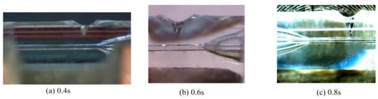 As shown by the above formula, when the laser action time is 0.9 s, the penetration depth is 0.836 mm, and the diameter of the through hole of the glass ferrule is 126–128 μm. The middle value of 127 μm is taken for calculation, and the thickness of the pipe wall is 0.9 − 0.127/2 ≈ 0.837 mm. Therefore, to ensure that the optical fiber is not fused by the heat generated by the laser, the laser action time of 0.9 s is adopted for deep penetration welding. In addition, since quartz glass must be heated to 1750 °C or higher when welding, the welding area of the optical fiber must be annealed after deep penetration welding, and the total time of laser action is 1.2 s. The period of 0–0.9 s is the deep penetration welding process of the laser, with a duty cycle of 80%; the period of 0.9–1.2 s is the laser annealing process of the optical fiber in the welding area, with a duty cycle of 20%. The welding results are shown in Figure 7. The results show that the required penetration depth can be obtained by increasing the laser action time. When the laser action time is 0.9 s, the inverted cone-shaped keyhole can achieve the optimal penetration state described in Part 3, and the optical fiber is fixed on the inner wall of the quartz glass ferrule: the glass in the molten state at the bottom of the keyhole tends to drip under the action of surface tension, gravity, and laser beam light pressure and moves towards the lower optical fiber. Then, the optical fiber is pressed down to the inner wall of the glass ferrule, so that it is stuck and pressed into the tiny glass ferrule through the hole. Finally, the deep penetration point welding between the quartz glass ferrule and the optical fiber is realized.