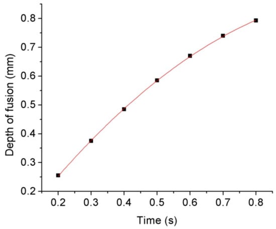 As the deep penetration welding between the quartz glass ferrule and optical fiber requires long-term laser action or a high-power laser to reach the required penetration depth, and the laser power used in the experiment is 60 W, the duty cycle of 80% is adopted to maintain the same; then, the effect of laser action time on the penetration depth of the keyhole during deep penetration welding is studied. Deep penetration laser welding was conducted for 0.2, 0.3, 0.4, 0.5, 0.6, 0.7, and 0.8 s. Because of the keyhole effect of deep penetration laser welding, an inverted cone-shaped keyhole is formed on the wall of the glass ferrule. The results are shown in Figure 5. As shown in Figure 5, the molten quartz glass at the edge of the keyhole is convex, which is because the molten quartz glass in the molten pool has certain fluidity during the deep penetration welding process, and the keyhole is formed under the pressure of a laser beam and steam in the keyhole. The molten quartz in the molten state in the molten pool around the keyhole flows outward at a relatively slow speed under the action of convection. The shape formed by cooling and solidification after stopping the laser action and the shape of the keyhole affects the transmission of laser energy. As the laser generates multiple Fresnel reflections, as shown in Figure 3 on the hole wall, the laser energy is transmitted to the bottom of the hole and absorbed, which then causes the material to heat up, melt, and vaporize. Based on this, the penetration of the hole deepens with the extension of the laser action time. The relationship between the laser action time and penetration depth of the keyhole is shown in Figure 6. The relationship between the penetration depth z and laser action time t is obtained by polynomial fitting as follows: