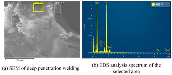 SEM and EDS analyses of the top view of the keyhole in deep penetration welding; the meaning of Chinese characters in the picture is selection area of spectrogram.