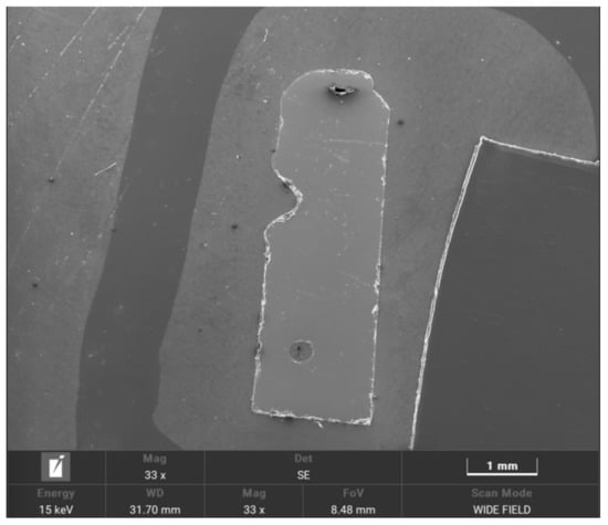 The SEM and EDS analyses of the top view of the keyhole in deep penetration welding are shown in Figure 8. Figure 8a shows that the surface of the hole formed by the molten pool is smooth, which helps the laser energy to form the Fresnel reflection, and then transfer to the bottom of the hole, resulting in improving the welding efficiency and quality. The EDS analysis results are shown in Table 1. The EDS analysis in Table 1 and Figure 8b shows that the main components of deep penetration welding materials are O and Si. Since the workpiece may be polluted and the quartz glass may be partially carbonized during deep penetration welding, a certain proportion of C is present in the EDS analysis results. The glass ferrule, after deep penetration welding, is fixed on the colloid, and then its side is ground and polished until a part of the hole formed by deep penetration welding is ground off. Then, the cross section of the hole is examined by SEM, and the results are shown in Figure 9. The SEM shows the entire morphological features of the ferrule after grinding on the side, and the V-shaped area is the part of the keyhole after grinding on the side. As shown by the figure, the shape of the hole conforms to the tapered hole formed by laser deep penetration welding, and the surface of the hole is not as smooth as that shown in Figure 9. This may be because there are a few cracks formed under the action of external forces during grinding and polishing because the molten pool has residual stress during cooling and solidification. The cracks do not affect the actual appearance of the inherent hole of the sensor or the application of the sensor. The key of the welding workpiece is that the waveguide characteristics of the optical fiber are not affected, and the optical fiber on the inner wall of the glass ferrule has sufficient bonding strength. In addition, the rough surface of the hole shown in Figure 9 may be caused by grinding and polishing, or the powder that remains after grinding and polishing. Additionally, the original smooth surface of the glass ferrule also became serrated due to grinding and polishing.