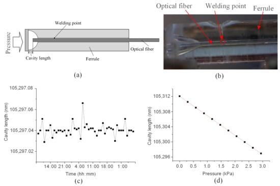 Performance test results of a laser welding sensor: (a,b) structure diagram of the sensor; (c) cavity length stability of the sensor; and (d) pressure response characteristics of the sensor.