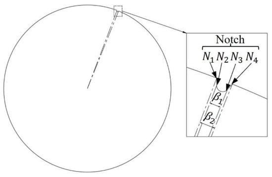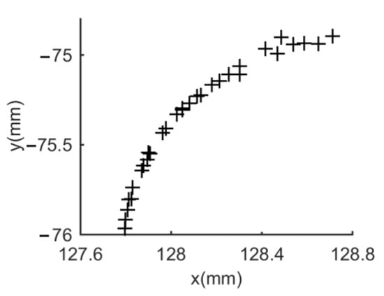 When 20,000 points are obtained by the laser ranging sensor, the coordinates of the two peaks are obtained by calculating the first-order difference of the data . The median point between the two peaks can be regarded as the approximate center of the arc. The central angle of the arc is 0.49°, so the points around the approximate center are classified as arc. The central angle of the notch is 1.04°, so the edge points after removing the points around the approximate center are taken as the circle edge points.