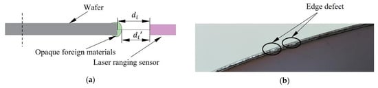 If Formula (6) is used to evaluate the error and fit it directly, a global optimal fitting value will be obtained. However, the edge of the wafer is not a perfect circle. When we detect the edge of the wafer, we will find that the morphology defects of the wafer mainly include depressions and protrusions. For example, when photoresist is spraying on the wafer, opaque impurities often adhered to its edge, as shown in Figure 3a [20]. Additionally, there are often defects at the edge of the wafer when it is processed, as shown in Figure 3b. If the impurities or defects are detected during scanning, the distance measured by the laser ranging sensor is incorrectly detected as . Additionally, , which made the measured value offset from the truth value. Obviously, the global optimal results will be affected by the outliers, which will reduce the fitting accuracy.