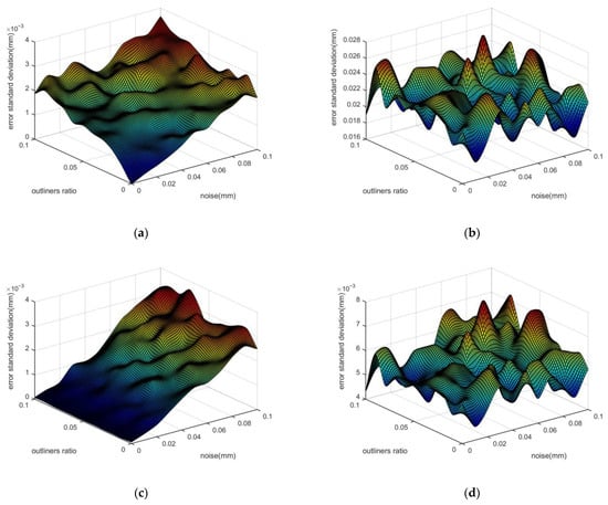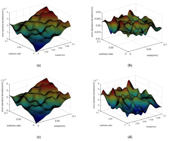 Figure 5 shows the simulation results; where (a) and (c) show the standard deviation of the position fitting deviation of the LSC method and the WFC method, respectively. The results show that when the standard deviation of Gaussian noise is 0 and the proportion of the outliner is 0, the fitting errors of both methods are close to 0. When the proportion of outliers increases, the fitting results of the LSC method are significantly affected by the outliers, and the error increases with the increasing of the proportion of outliers. The reason for this phenomenon is that the LSC method assigns the same weight to all points to find the global optimal solution. By contrast, the WFC method can suppress the outlier well with the help of weight. When the proportion of outliers is 0, the fitting errors of both algorithms increase with the increase of the standard deviation of Gaussian noise. Additionally, the accuracy of both methods is similar. If the Gaussian noise and the proportion of outliers increase at the same time, the WFC method can suppress the influence of the outliers better than the LSC method. The consistency of the WFC method is better than that of the LSC method in different proportions of outliers.