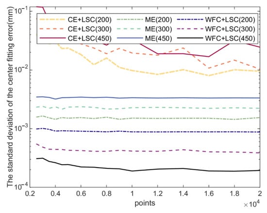 Figure 5b and d are the standard deviations of the radius fitting of the LSC method and the WFC method, respectively. The fitting trends of both methods are similar, and the accuracy of the WFC method is about three times that of the LSC method.