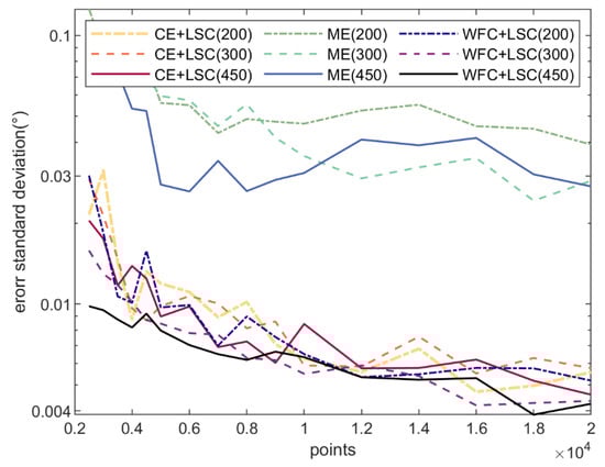 Figure 7 and Figure 8 show the standard deviation of the errors of fitting the center and orientation, respectively. Each wafer was sampled n (from 2500 to 20,000) points. Each combination was simulated 20 times. Finally, the standard deviation of the errors of the 20 simulation results was calculated.